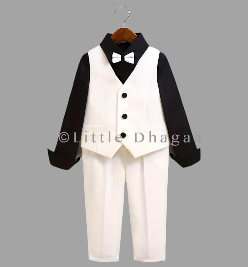 Give your little prince a royal look with our Boys 4-Piece White Tuxedo Suit, specially crafted for weddings, first birthdays, receptions and grand celebrations. This complete designer tuxedo set includes a stylish blazer, matching waistcoat, black shirt, trousers, and bow tie, ensuring a sharp and elegant appearance for every special occasion.