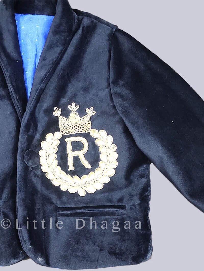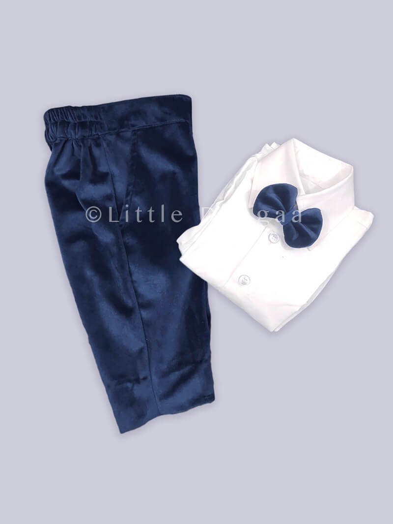 The outfit is an adorable little boy’s navy blue colour velvet suit for boys and is designed for little ones. It consists of three main components: a full-sleeve birthday party velvet blazer with embroidery design, velvet pants, and a full-sleeved white shirt with a bow tie. This navy blue velvet three-piece party wear suit for your first birthday, wedding adds a polished and sophisticated touch to the overall look of your little handsome.