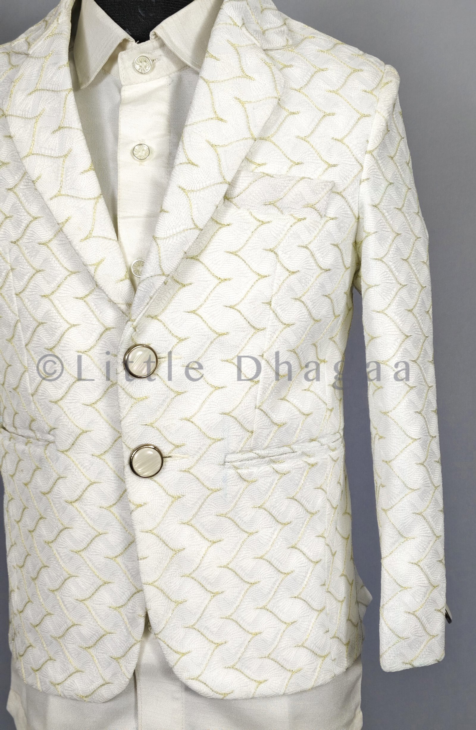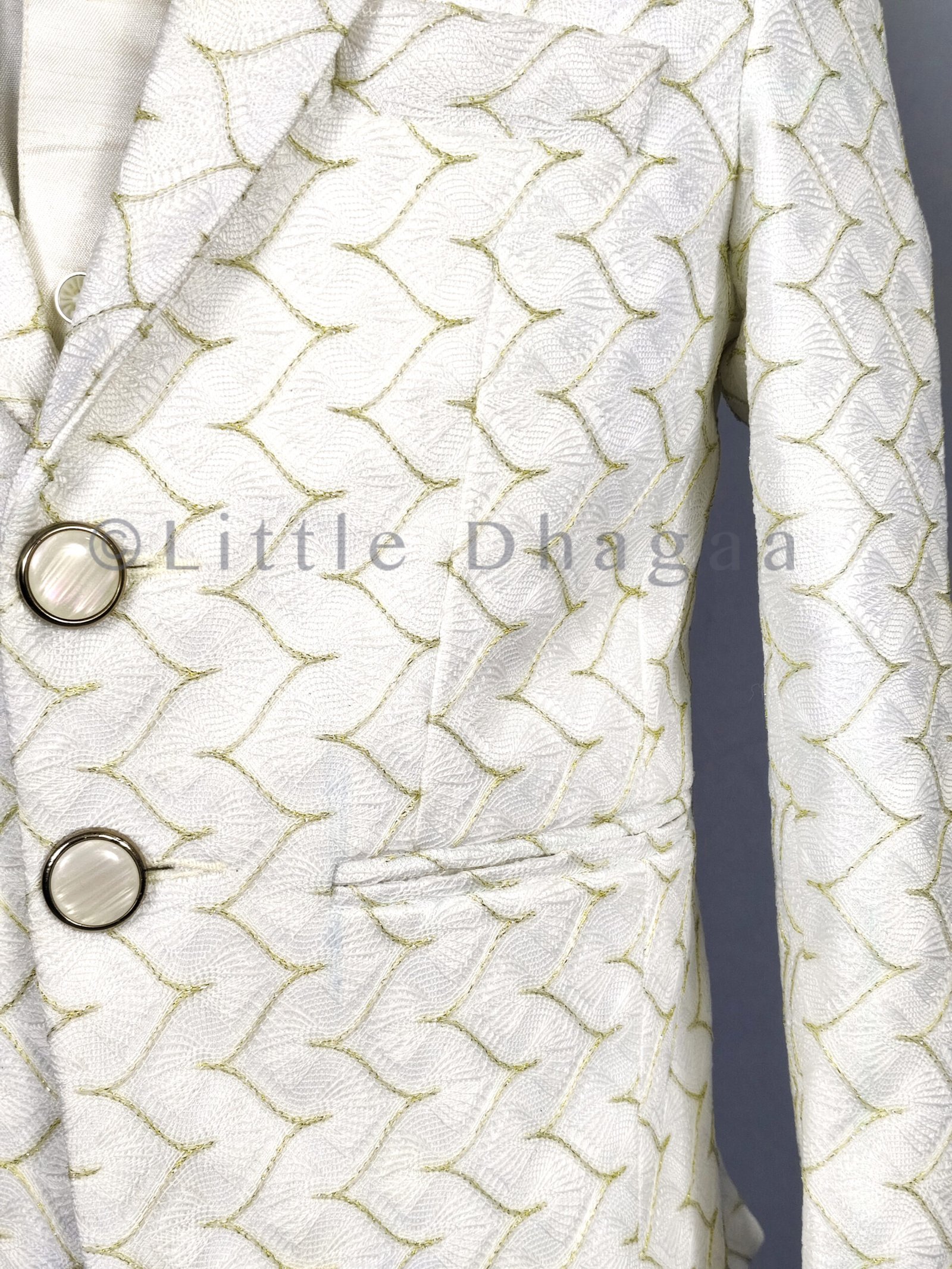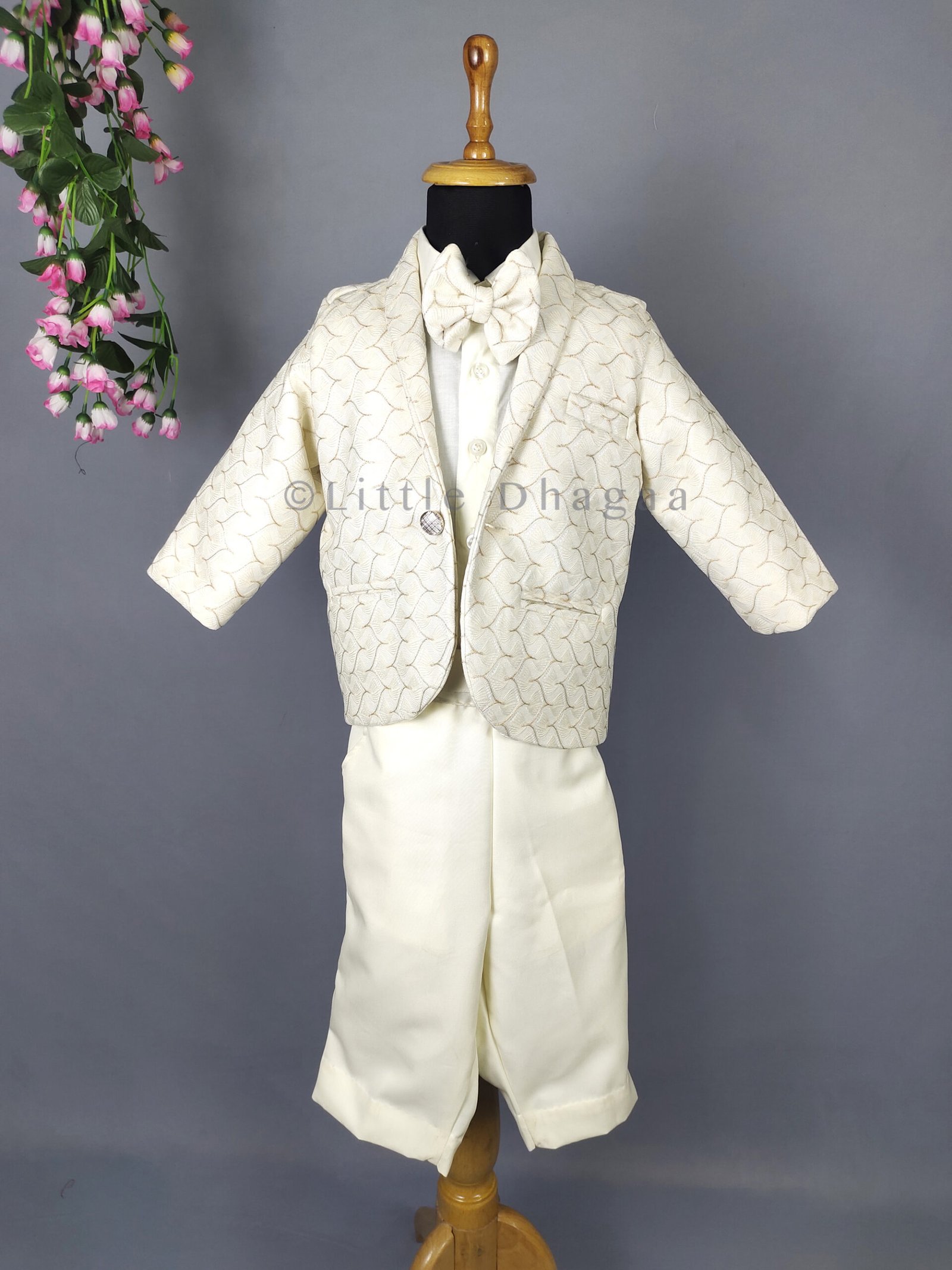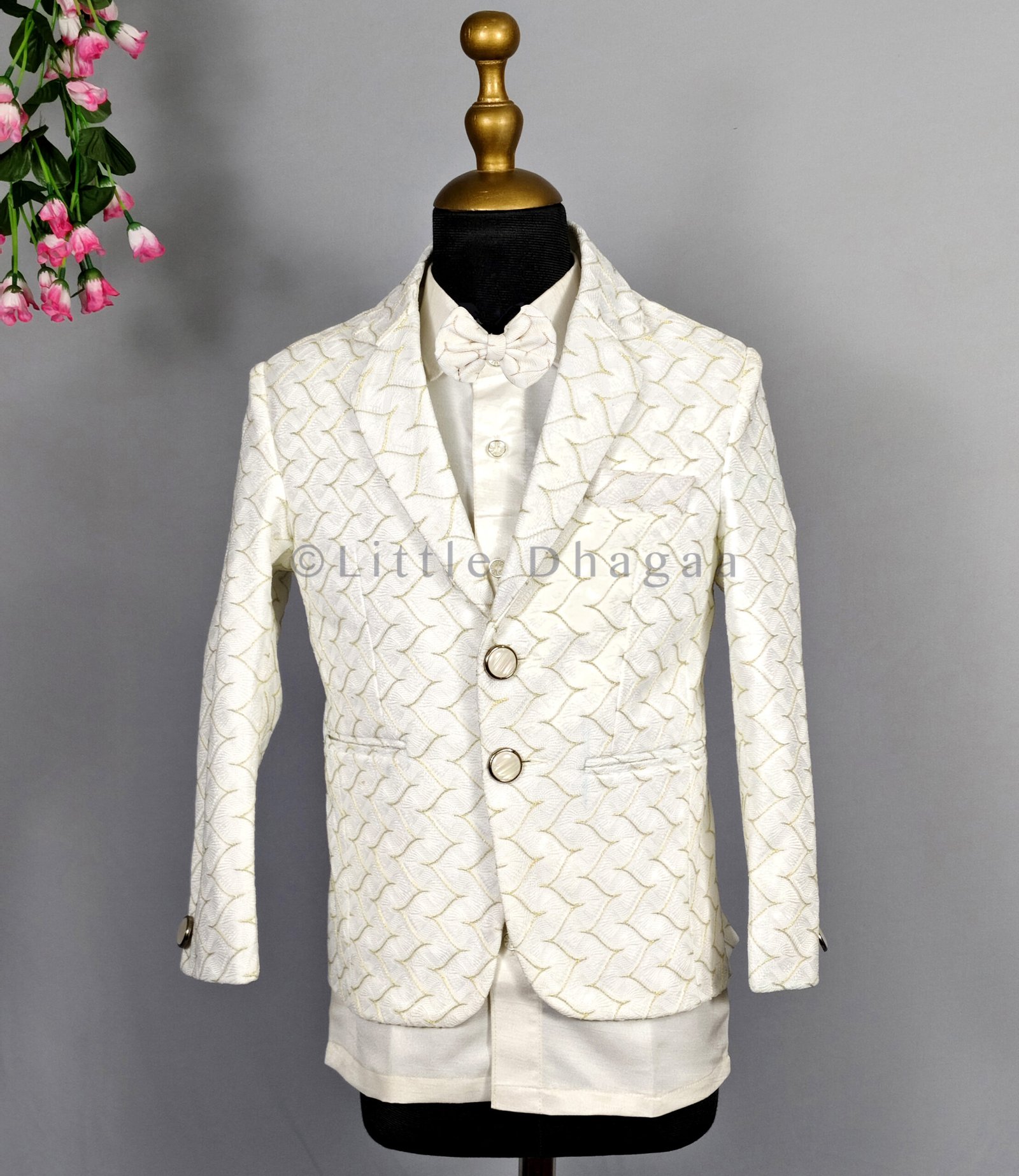 Give your little one a charming and classy look with this boys white 3-Piece tuxedo suit. Expertly tailored for christening & special occasions, this elegant party suit set includes a crisp white blazer, matching trousers, and a shirt with a bow tie. Made from soft, breathable fancy fabric for all-day comfort, it ensures your baby boy looks adorable and feels at ease. Perfect for christenings, weddings, birthdays, and formal celebrations, this outfit adds a touch of timeless sophistication.