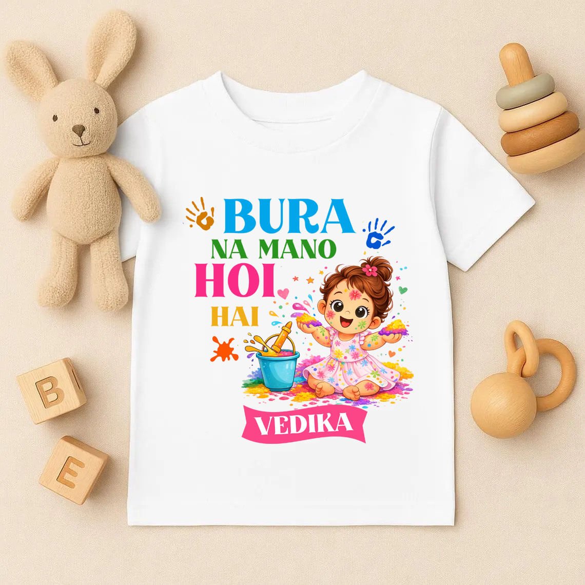 Let your little one celebrate in style with our Custom Name Bura Na Mano Holi Hai T-Shirt for baby girl. Made from 100% soft and breathable cotton, this T-shirt ensures all-day comfort during colorful Holi celebrations. The fun “Bura Na Mano Holi Hai” print, along with your child’s custom name, adds a unique and festive touch. Perfect for Holi parties, school events, and family gatherings, it’s designed for girls. Create joyful and memorable Holi moments with a personalised outfit made just for your kid.