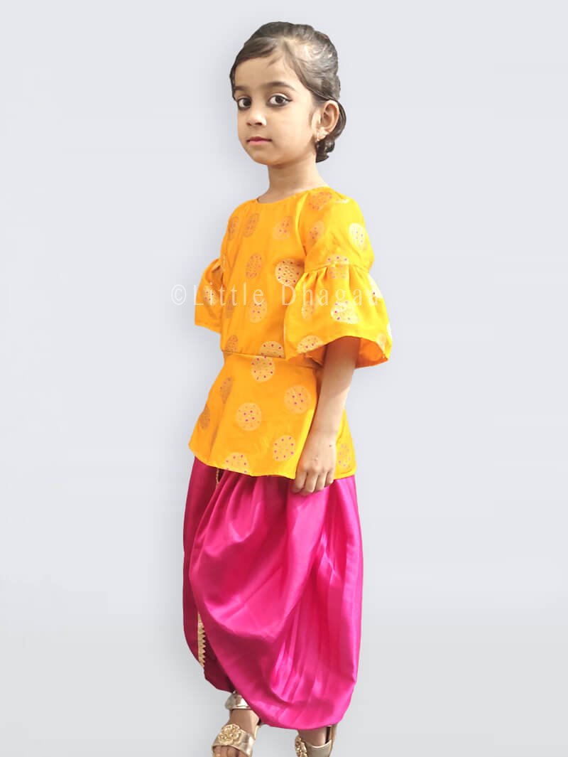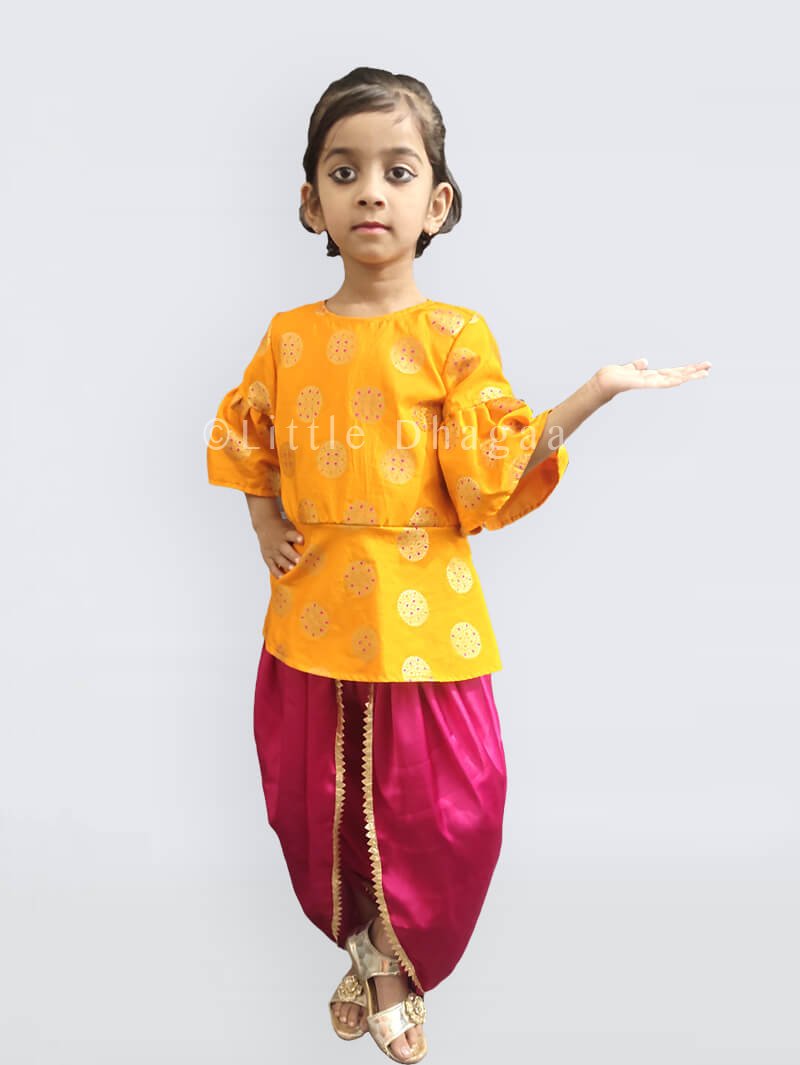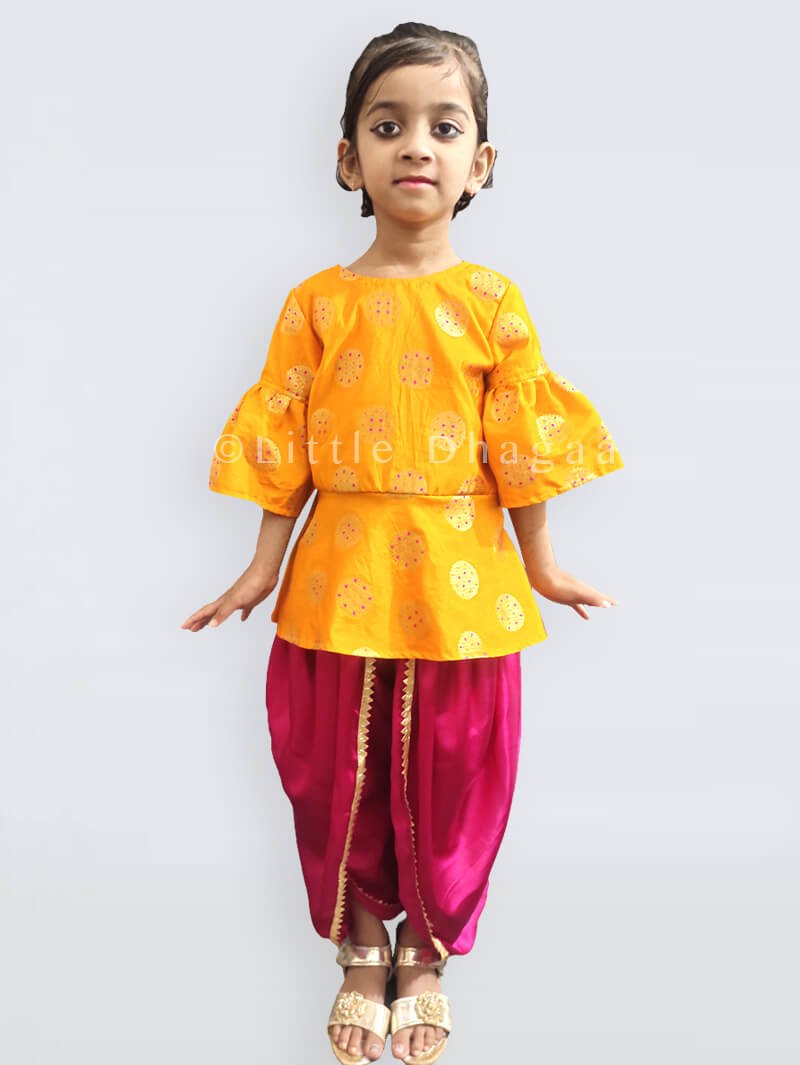 It is a yellow and pink Indian wedding outfit designed for little girls with brocade and satin fabric. This peplum top and dhoti for kids and girls is a superb dress for a traditional dress online. The top of this girl’s dress is of yellow printed comfy fabric with stylish sleeves. Dhoti is a dark pink coloured flowing garment with golden lace around it. The designer kids’ peplum top with dhoti is suitable for the upcoming festive season, Haldi Function, Wedding and Occasion wear.