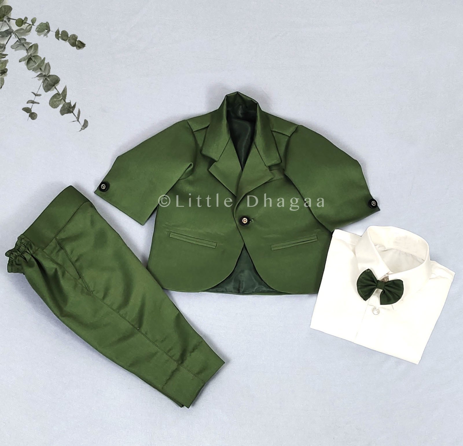 Dress your little gentleman in this Elegant green 3-Piece party wear suit for kids and baby boy, perfect for weddings, first birthdays, and festive occasions. This premium outfit includes a stylish blazer, matching trousers, and a pant with bow tie for a complete formal look. It ensures all-day comfort with a touch of sophistication. Designed to make your boy stand out at every event, this classy party suit is ideal for special celebrations. Available online in India with custom size options for the perfect fit.