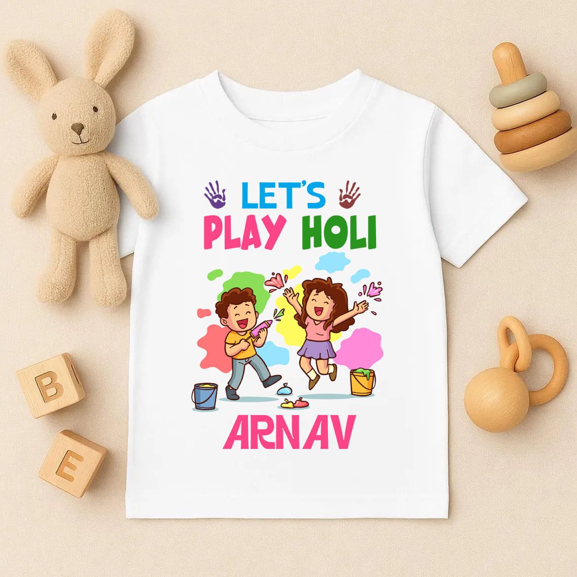 Get your little ones ready for colorful fun with our Personalised Let’s Play Holi T-Shirt for Boys & Girls. Crafted from 100% soft and breathable cotton, this T-shirt keeps kids comfortable during all the festive excitement. The vibrant “Let’s Play Holi” print adds a playful and cheerful touch, perfect for school events, Holi parties, and family celebrations. Designed for both boys and girls, it offers a relaxed fit and gentle feel on the skin. A must-have Holi Tshirt to make your child’s celebration bright, joyful, and full of fun!