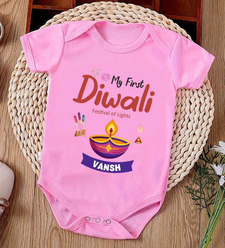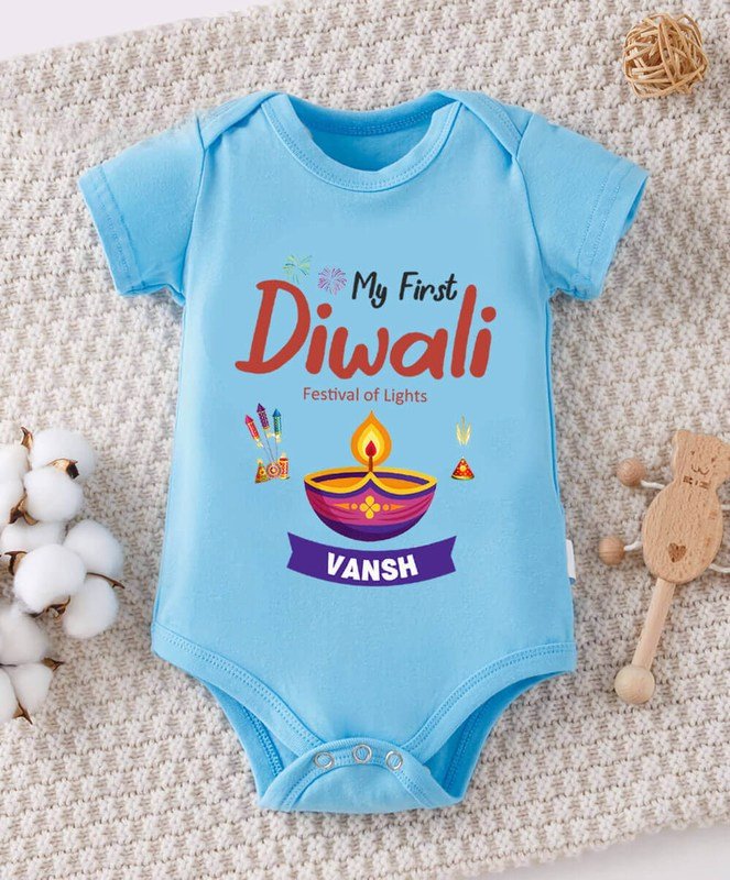 Make your baby’s first Diwali extra special with this charming customizable romper, bodysuit, or onesie. Crafted from soft and gentle cotton, it keeps your little one comfortable throughout the festive celebrations. The cute “My First Diwali” print can be personalized to add a unique, memorable touch. Perfect for 1stDiwali photos, family gatherings, or as a thoughtful gift for new parents.A delightful outfit for newborn baby boys and girls to celebrate the festival of lights in style.