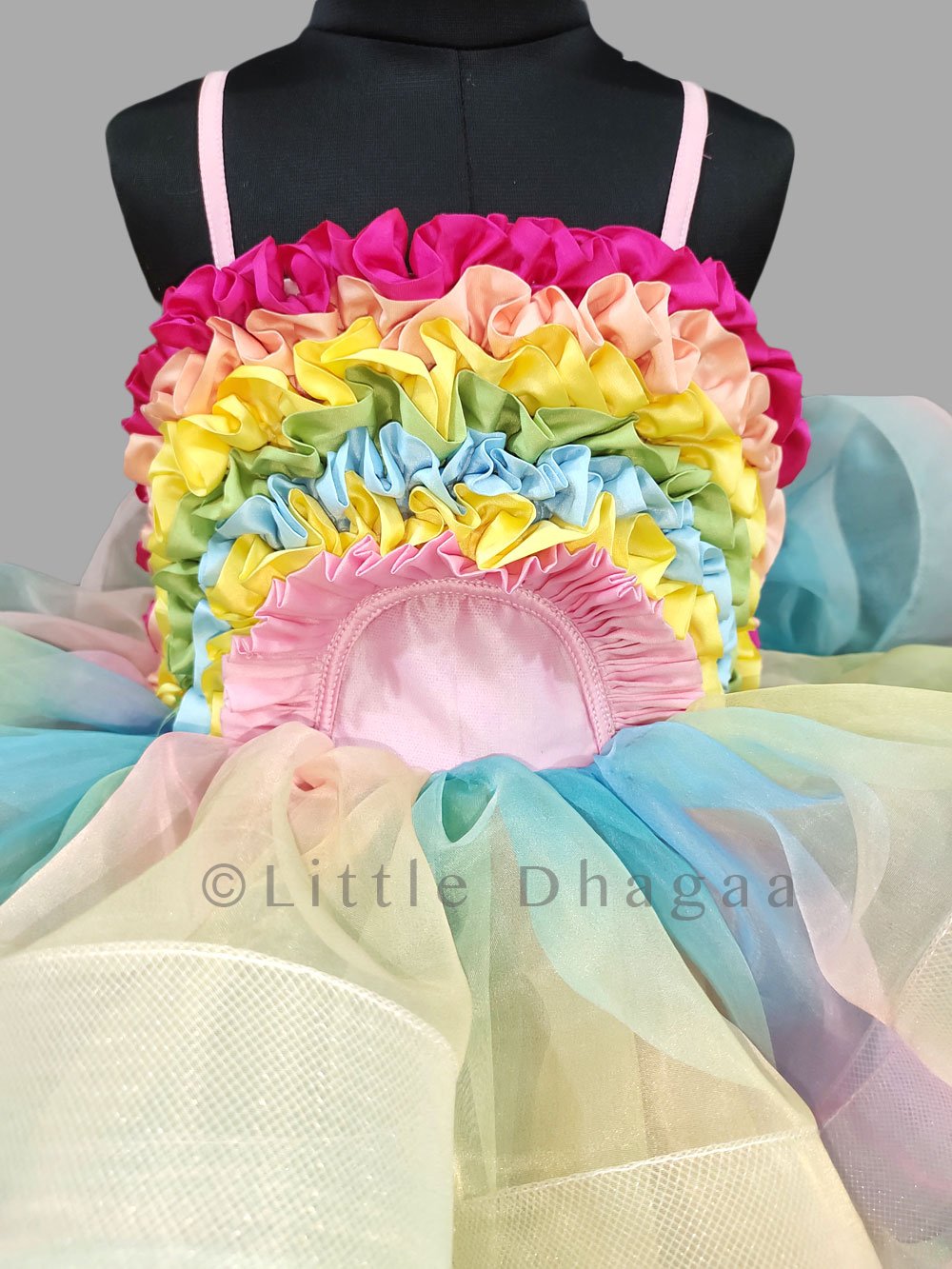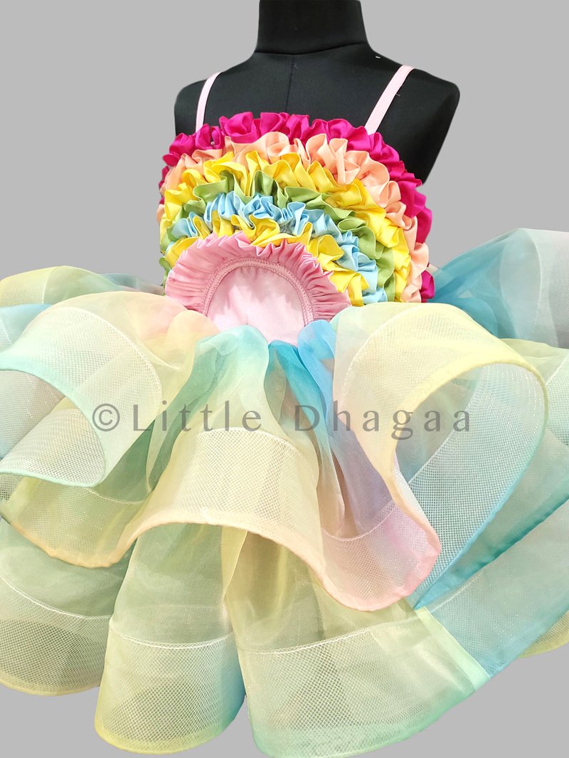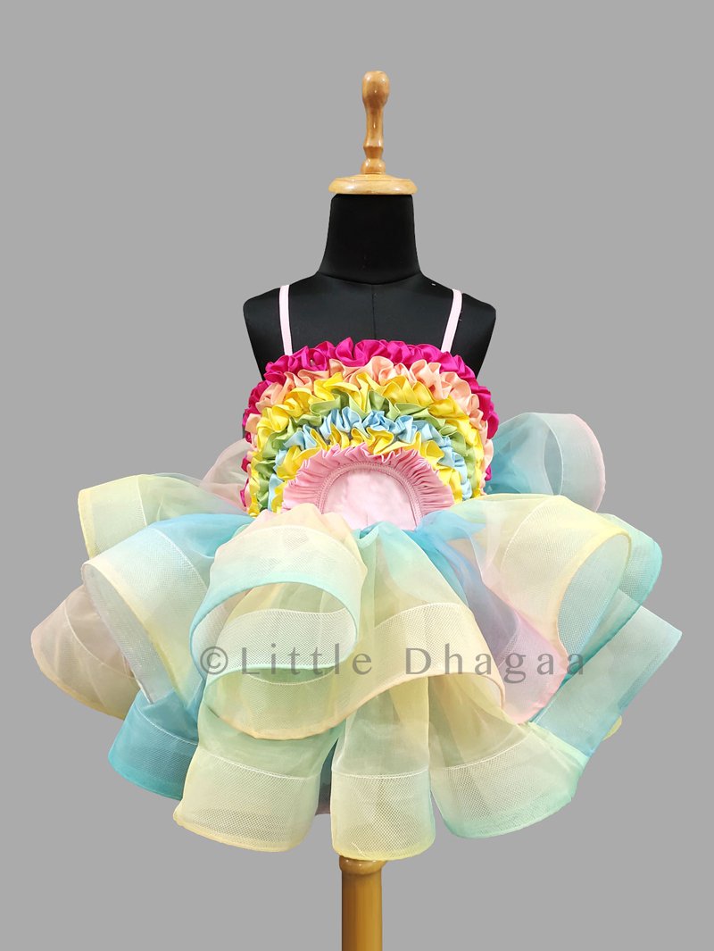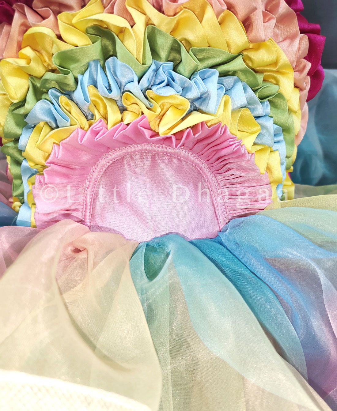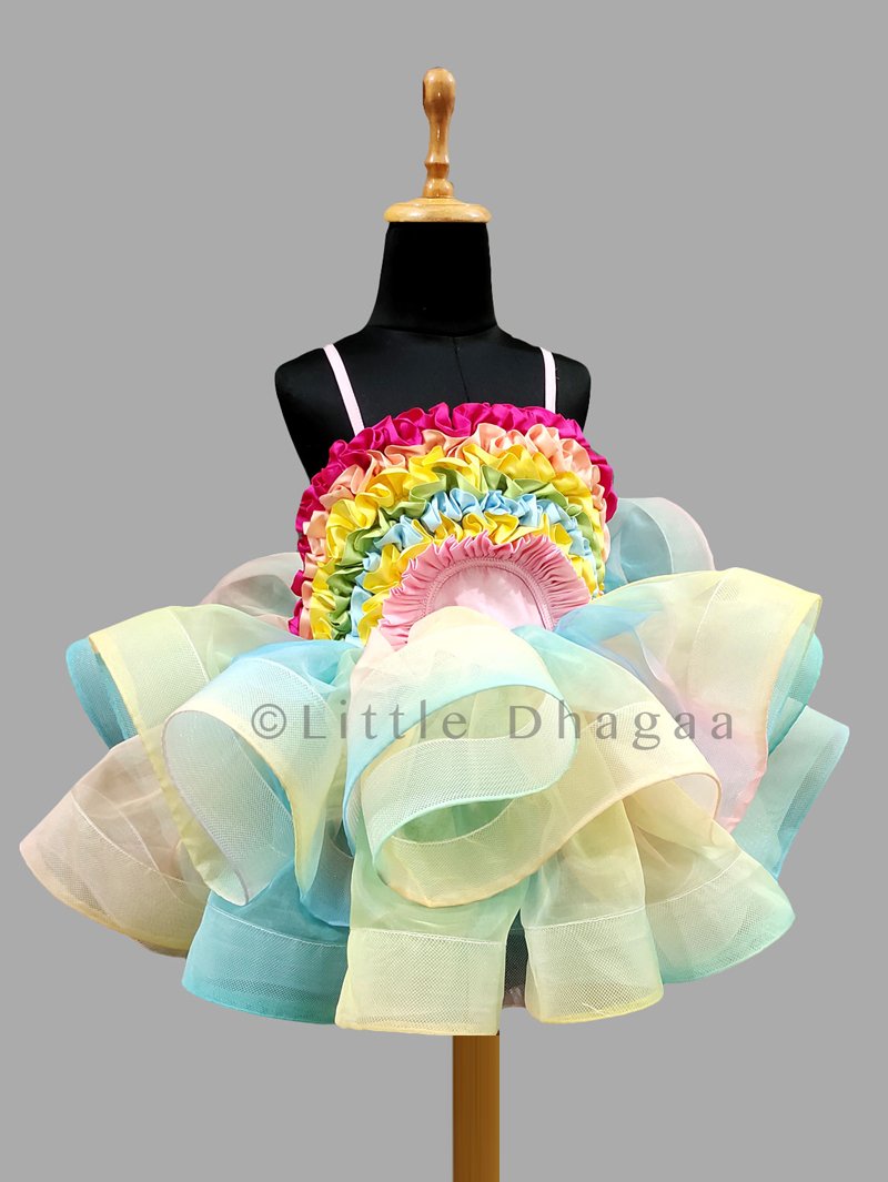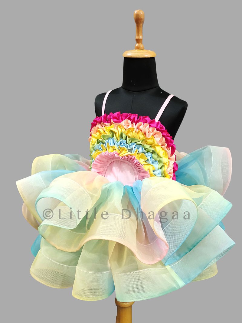 The baby girl Rainbow unicorn theme birthday frock is a delightful dress made with high-quality materials. The dress has a unicorn feel with comfortable wear. This unicorn first birthday dress features a vibrant rainbow-colored frock adding a stylish touch to the overall look. The colorful design is complemented by the addition of unicorn-themed and a matching headband. You can buy this beautiful unicorn dress online in India. A magical girls unicorn dress for birthday party, photoshoot, theme party and special events!!